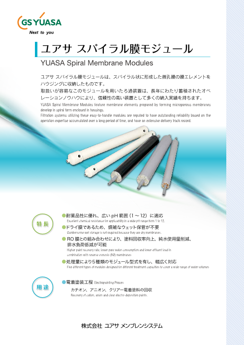 「ユアサ浸漬型膜モジュール」はユアサメンブレンシステムが独自に開発した精密ろ過膜(ユアサメンブレンフィルター)を使用した槽浸漬型の大容量膜ろ過モジュールです。 ユアサ浸漬型膜モジュールは、水槽に浸漬した精密ろ過膜で原水を固液分離することによって、バクテ...