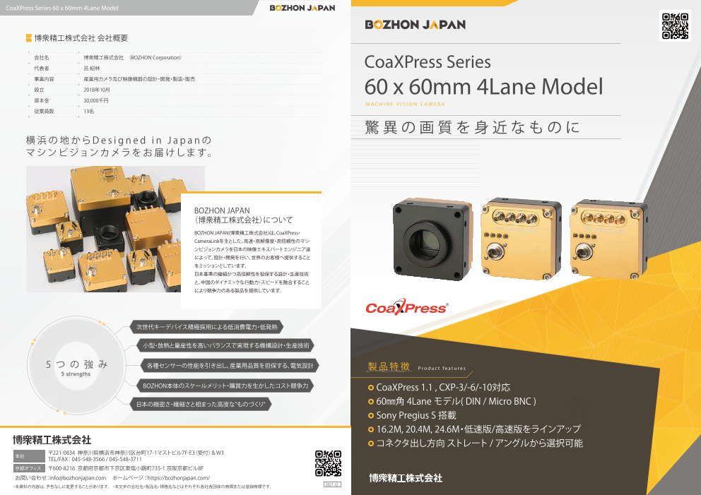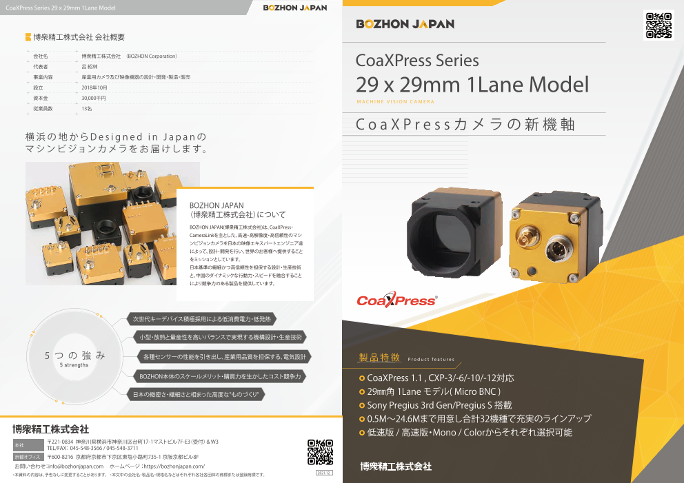 1レーン当たり最大転送速度12.5Gbpsを誇る業界屈指の標準高速インターフェース 高画素・高速且つ、低レイテンシーでの安定した画像取得が可能 掲載製品 ・29×29mm 1Lane Model ・FANレス65Mカメラ BC-GM65M...