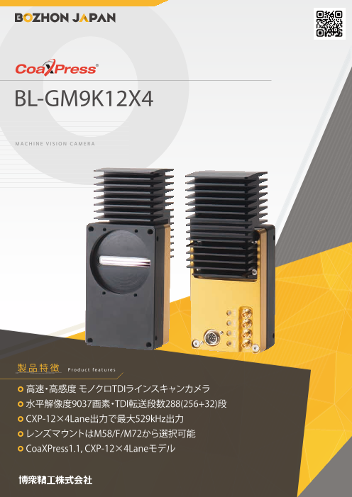 ●CXP-12を最大4接続可能で最大529kHz出力できます。 ●水平解像度9037画素、TDI転送段数288段になります。 ●CoaXPress1.1に準拠しています。