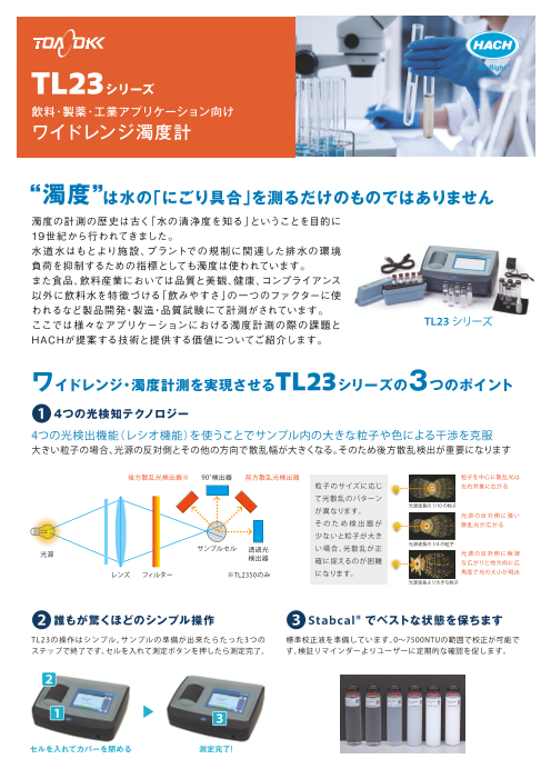 濁度の計測の歴史は古く「水の清浄度を知る」ということを目的に 19世紀から行われてきました。 水道水はもとより施設、プラントでの規制に関連した排水の環境 負荷を抑制するための指標としても濁度は使われています。 また食品、飲料産業においては品質と美...