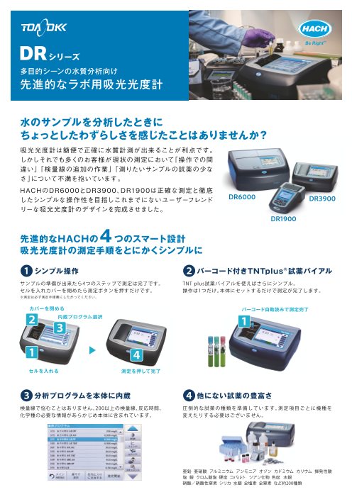 吸光光度計は簡便で正確に水質計測が出来ることが利点です。 しかしそれでも多くのお客様が現状の測定において「操作での間 違い」 「検量線の追加の作業」 「測りたいサンプルの試薬の少な さ」について不満を抱いています。 H ACHのD R 6 0 0...