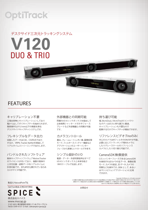 ◆キャリブレーション不要 ◆外部機器との同期可能 ◆持ち運び可能 ◆フレキシブルなデータ出力 ◆カメラコントロール ◆リファレンスビデオ(Trioのみ) ◆バンドルされたソフトウェア ◆シンプル設計のI/O ◆CameraSDK無償提供 ...