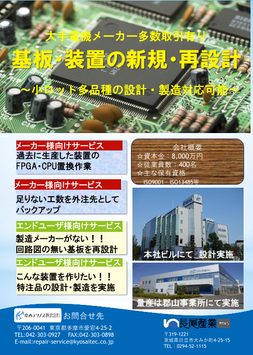 ◆ メーカー様向けサービス 過去に生産した装置の FPGA・CPU置換作業 足りない工数を外注先としてバックアップ ◆エンドユーザ様向けサービス 製造メーカーがない!! 回路図の無い基板を再設計 こんな装置を作りたい!! 特注...