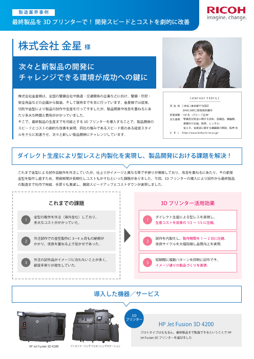 株式会社金星様は、全国の警備会社や鉄道・交通関係の企業などに向け、警備・防犯・安全用品などの企画から製造、そして販売までを主に行っています。金星様では従来、切削や金型により製品の試作や生産を行ってきましたが、製品開発や改良を重ねるにあたり多大な時...