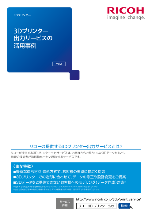 リコーが提供する3Dプリンター出力サービスは、お客様からお預かりした3Dデータをもとに、熟練の技術者が造形物を3Dプリントして造形してお届けするサービスです。造形物の用途やご予算に合わせて最適な造形材料・造形方式・後加工などをご提案します。通常の加工方法...