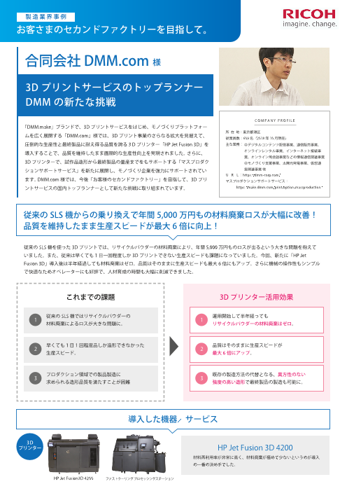 「DMM.make」ブランドで、3Dプリントサービスをはじめ、モノづくりプラットフォームを広く展開する「DMM.com」様では、3Dプリント事業の拡大を見据えて、 圧倒的な生産性で最終製品の製造も可能な「HP Jet Fusion 3D」を導入により、品...
