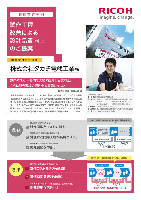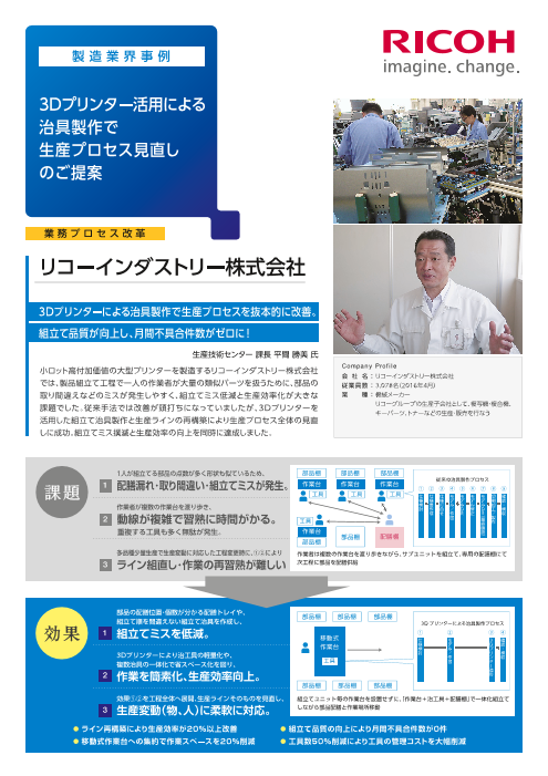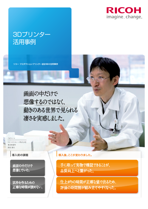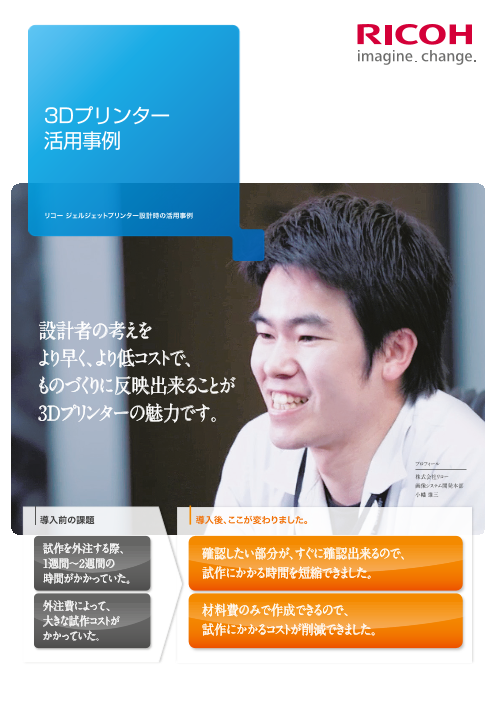 ジェルジェットプリンターの設計を行なっているリコーテクノロジーセンターでは、試作の外注に1〜2週間の時間をかけていました。試作部分を3Dプリンターで出力することで、すぐに手で触れて確認し、設計者の考えをより早く確実に反映できるようになりました。操作性や量...