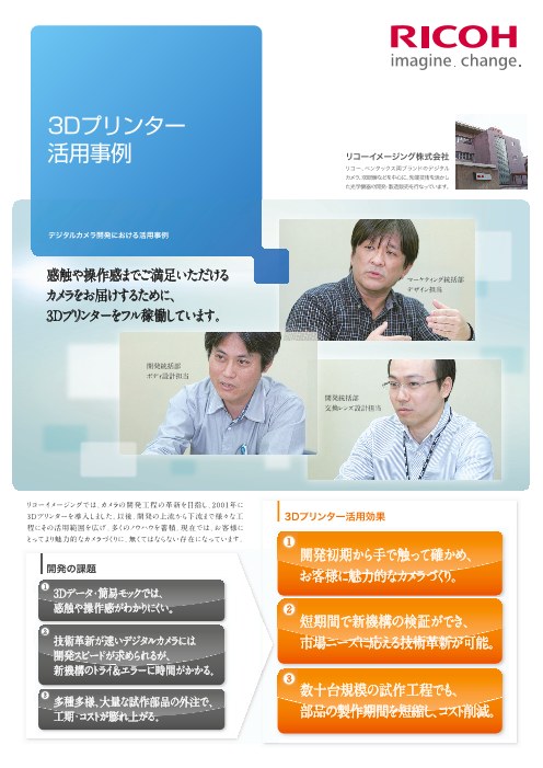 デジタルカメラには、お客様が触ったときの数値に表れない魅力が求められます。また技術の進化が早いため、市場ニーズに応えるには新機構の検証などをスピーディーに行なえる開発体制が必要です。リコーイメージングでは3Dプリンターを活用することで、製品開発の初期段階...