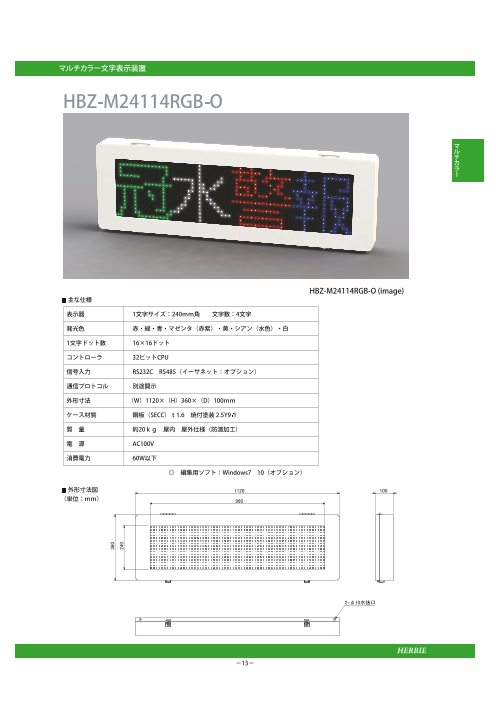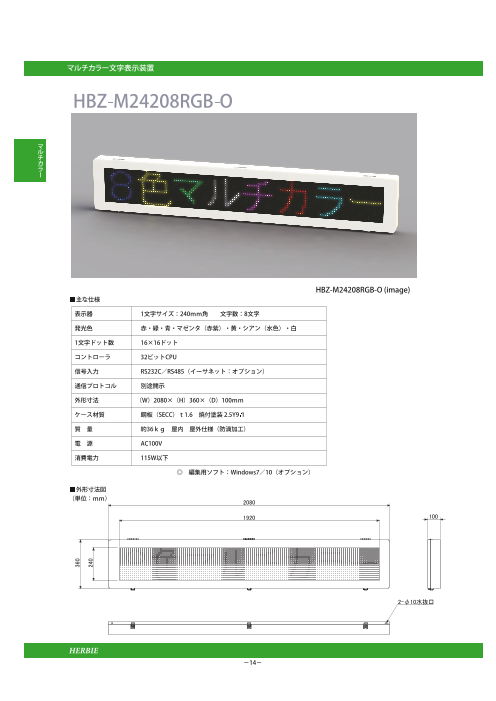 パーソナルコンピュータ・シーケンサ等で文字データを入力し、RS232C/RS485(Ethernet)通信でその内容をマルチカラーLED文字表示器に表示する装置です。 1文字サイズは96・160・240・320(mm)の4アイテムがあり、カタログに...