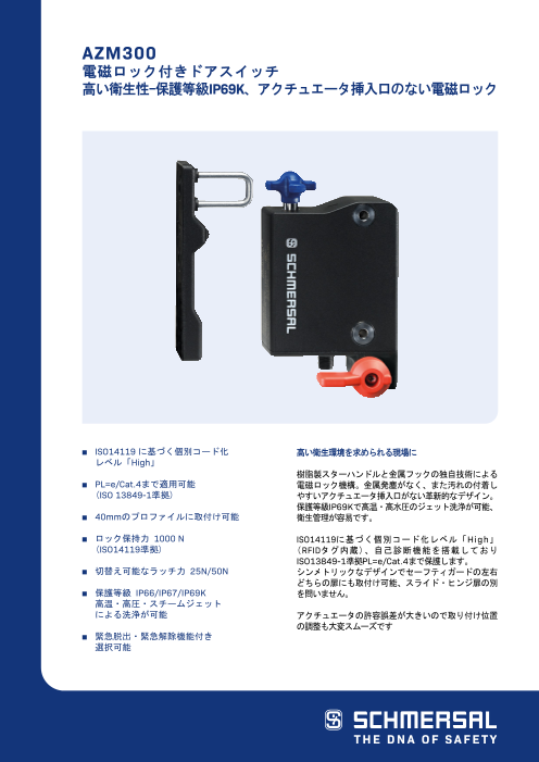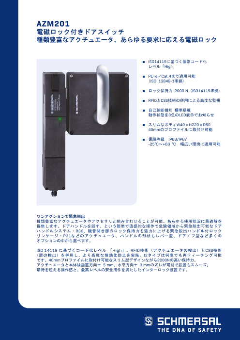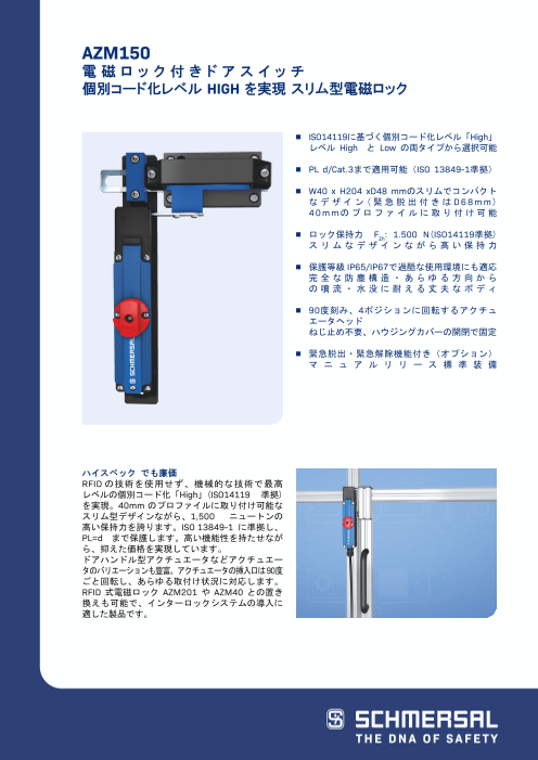 AZM40は、世界最小クラスの電子式電磁ロック付きインターロックとして、限られたスペースにも柔軟に対応する革新的なセーフティコンポーネントです。"SAFE. FLEXIBLE. SMALL."を製品コンセプトとし、包装機械、製薬機械、木材加工機械など、ス...