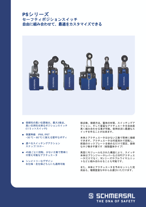 ■信頼性の高い位置検出、最大3接点。 高い汎用性を誇るポジションスイッチ(リミットスイッチ) ■保護等級 IP66, IP67 −30 °C ~ 80 °C に耐える堅牢なボディ ■選べるスイッチングアクション スナップ/スロー ■45度ごとに...