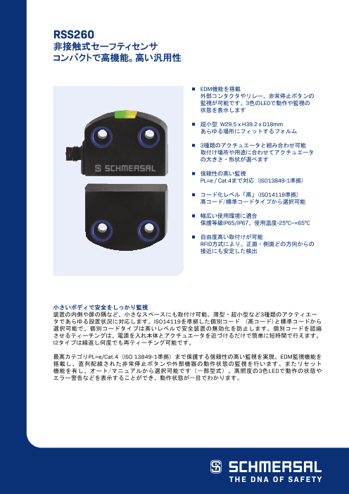 ■EDM機能を搭載 外部コンタクタやリレー、非常停止ボタンの監視が可能です。3色のLEDで動作や監視の状態を表示します ■超小型 W29.5 x H39.2 x D18mm あらゆる場所にフィットするフォルム ■3種類のアクチュエータと組み合わせ...