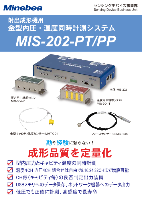 成形品の品質に直結する重要なパラメータであるにも関わらず、これまでブラックボックスとされてきた「型内圧波形」「型内キャビティ温度波形」を簡便に低コストで測定、管理、記録することができます。 型内圧力とキャビティ温度の同時計測 温度4CH 内圧4C...