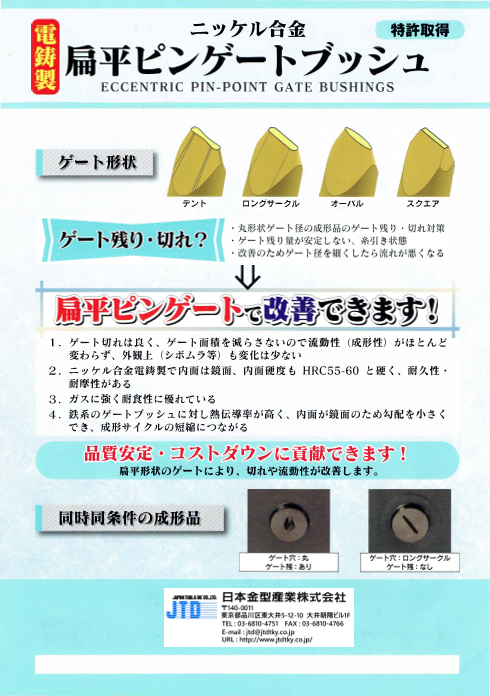 扁平形状のゲートにより、切れや流動性が改善します。 品質安定・コストダウンに貢献できます ・丸形状ゲート径の成形品のゲート残り・切れ対策 ・ゲート残り量が安定しない、糸引き状態 ・改善のためゲート径を細くしたら流れが悪くなる ↓↓↓↓↓↓↓...