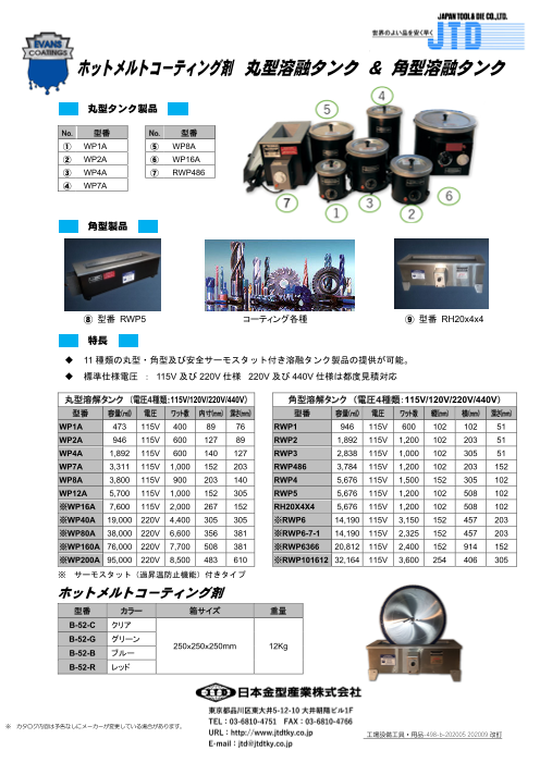 11種類の丸型・角型及び安全サーモスタット付き溶融タンク製品の提供が可能。 標準仕様電圧 : 115V 及び 220V 仕様 220V 及び 440V 仕様は都度見積対応