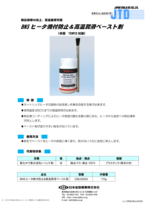 カートリッジヒータ交換時の抜き差し作業を改善する事が出来ます。 使用温度850℃までの高温使用が出来ます。 熱伝導コーディングによりヒータ表面の酸化を最小限に抑え、ヒータから金型への熱伝導率 が向上します。 ペースト剤が塗りやすい刷毛が付いていま...