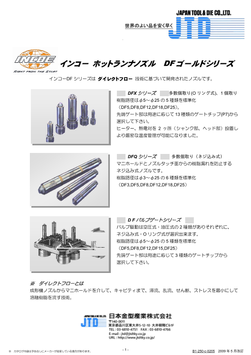 ■多数個取り(O リング式)、1 個取り 樹脂路径はφ5~φ25 の 5 種類を標準化。 ・先端ゲート部は用途に応じて 13 種類のゲートチップから選択して下さい。 ・ヒータ、熱電対を 2 ヶ所(シャンク部、ヘッド部)設置しより厳密な温度管理が可能に...