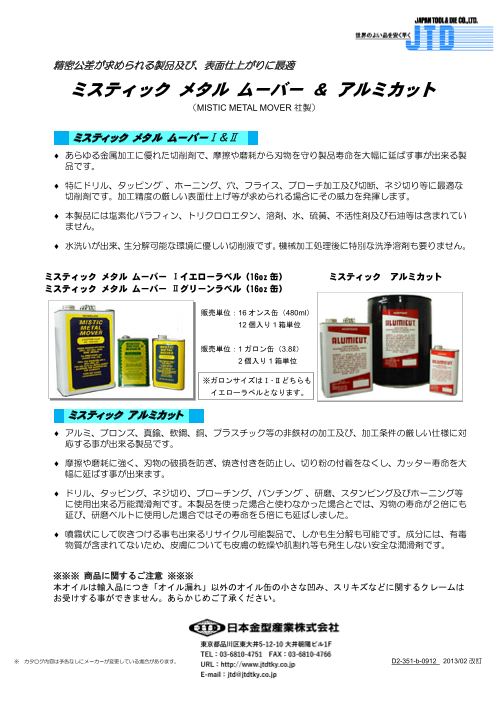 ♦ あらゆる金属加工に優れた切削剤で、摩擦や磨耗から刃物を守り製品寿命を大幅に延ばす事が出来る製 品です。 ♦ 特にドリル、タッピング゙、ホーニング、穴、フライス、ブローチ加工及び切断、ネジ切り等に最適な 切削剤です。加工精度の厳しい表面仕上げ等が...