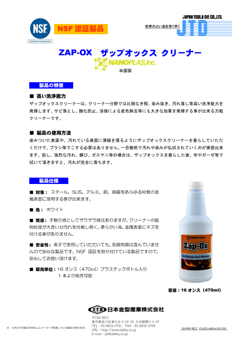 ■ 高い洗浄能力 ザップオックスクリーナーは、クリーナー分野では比類なき程、染み抜き、汚れ落し等高い洗浄能力を 発揮します。サビ落とし、酸化防止、溶接による変色除去等にも大きな効果を発揮する事が出来る万能 クリーナーです。