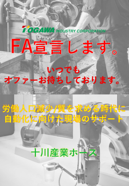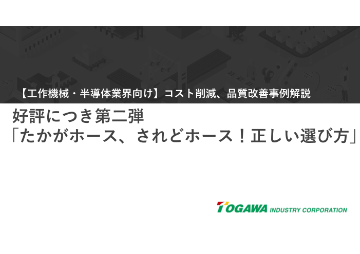 ご担当者様、朗報です!! ◆固定配管からホース配管への変更。 ◆現在お使いのホース配管を別のホースに換えたい。 折れてしまう、漏れてしまう、硬くなってしまう等・・・お困りではありませんか? 十川産業株式会社には、様々な素材のホ...
