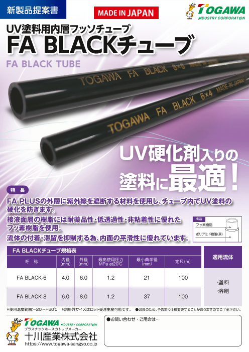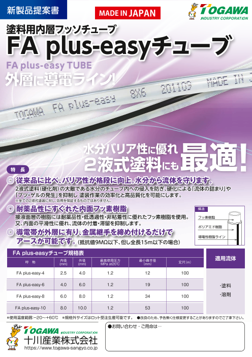 <特徴> ◎FA PLUSの外層に紫外線を遮断する材料を使用し、チューブ内でUV塗料の 硬化を防ぎます。 ◎接液面層の樹脂には耐薬品性・低透過性・非粘着性に優れた フッ素樹脂を使用。 ◎流体の付着・滞留を抑制する為、内面の平滑性に優れ...