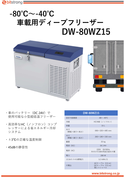 車のバッテリー(DC 24V)で 使用可能な小型超低温フリーザー
