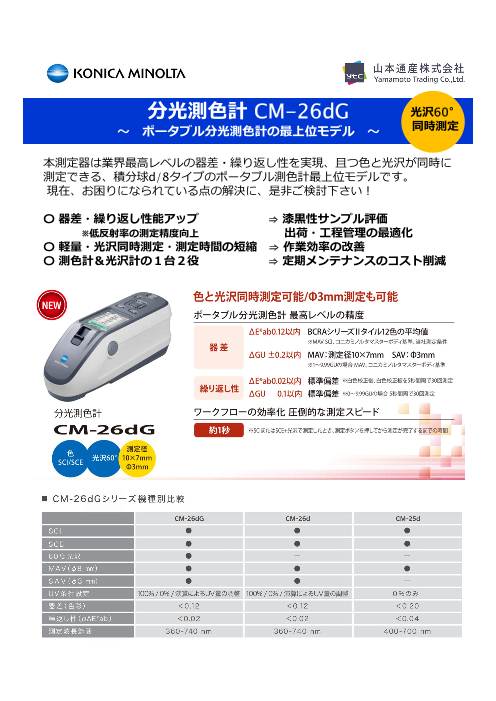 本測定器は業界最高レベルの器差・繰り返し性を実現、且つ色と光沢が同時に 測定できる、積分球d/8タイプのポータブル測色計最上位モデルです。 現在、お困りになられている点の解決に、是非ご検討下さい! ◆器差・繰り返し性能アップ ...