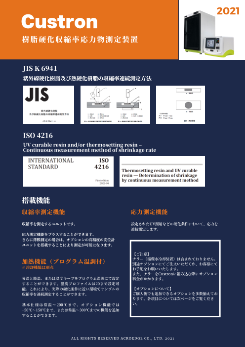 樹脂硬化収縮応力測定装置「CUSTRON」は、UV硬化樹脂・熱硬化樹脂・エポキシ樹脂・UV接着剤・UVインク・コーティング・ワックス等の硬化に伴う硬化収縮率・収縮応力を連続測定できる樹脂硬化収縮応力測定装置です。 UV照射→加熱→冷却など昇温、降温の熱...