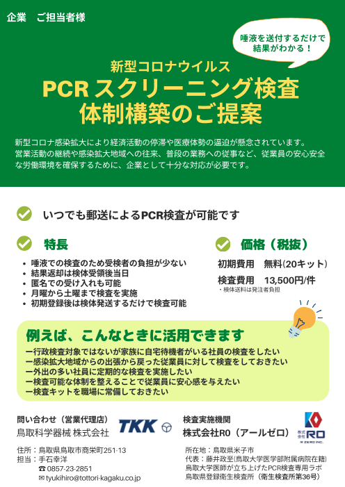 ・唾液で検査のため受検者の負担が少ない ・結果返却は検体受領後当日 ・匿名での受け入れも可能 ・月曜から土曜まで検査を実施 ・初期登録後は検体発送するだけで検査可能