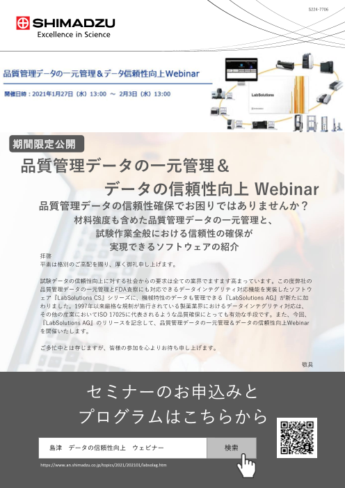 2020/10にリリースした「LabSolutions AG」に関連したWebinarをお客様向けに開催します。 データインテグリティ対応が求められる医薬系や一部の食品業界の企業のみならず、 昨今データ改ざん問題があった材料業界(鉄、非鉄、プラス...