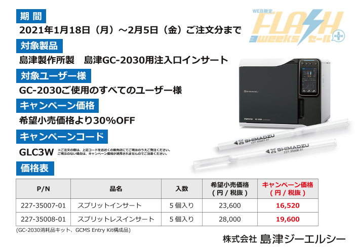 web上で実施している限定セールを、今月も実施いたします! 島津製作所製のGC注入口インサートが30% OFF! 2021年1月18日(月)からスタートします。 https://solutions.shimadzu.co.jp/glc/3weeks...