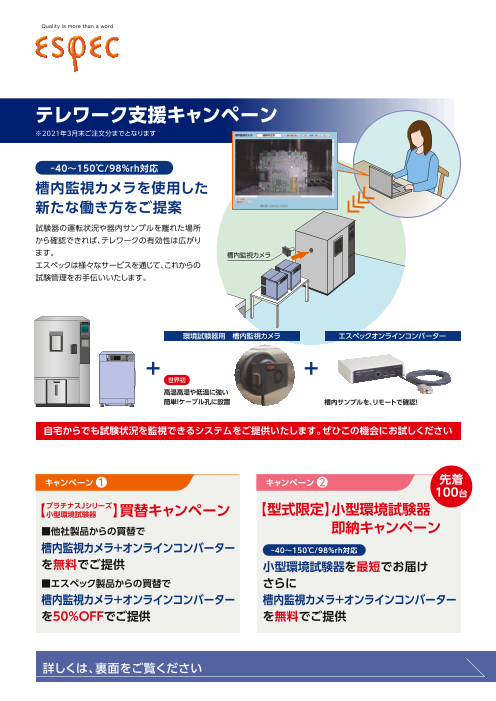 新型コロナウイルスの感染拡大に伴い、自宅等でのテレワークが急速に進んでいます。一方、環境試験業務においては、対面での対応や試料の確認、装置の操作などが必要なことから、テレワークへの移行が困難に感じている方も多くいらっしゃることと思います。 エスペックで...