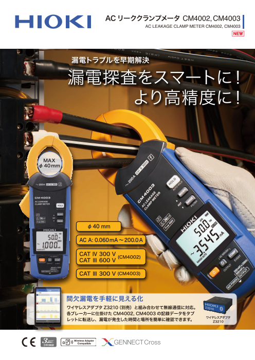 ● ワイヤレス化に対応! スマホやタブレットに測定値を転送 (オプション:ワイヤレスアダプタ Z3210 装着時) ● 新設計のセンサで微小な漏れ電流を正確に検出(直径 φ40 mmまで) ● 漏れ電流から負荷電流までワイドに測定 ● リーククラン...