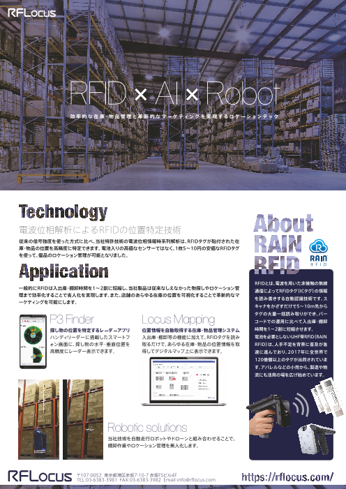 従来の信号強度を使った方式に比べ、当社特許技術の電波位相情報時系列解析は、RFIDタグが貼付された在庫・物品の位置を高精度に特定できます。電池入りの高価なセンサーではなく、1枚5~10円の安価なRFIDタグを使って、個品のロケーション管理が可能となりまし...