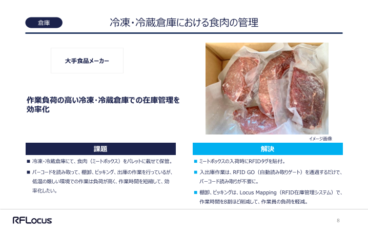 作業負荷の高い冷凍・冷蔵倉庫での在庫管理を効率化 【課題】 冷凍・冷蔵倉庫にて、食肉(ミートボックス)をパレットに載せて保管。 バーコードを読み取って、棚卸、ピッキング、出庫の作業を行っているが、低温の厳しい環境での作業は負荷が高く、作業時間を...