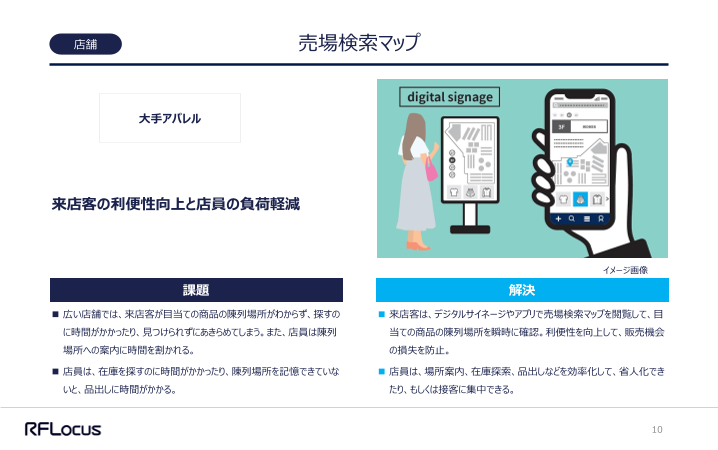 来店客の利便性向上と店員の負荷軽減 【課題】 広い店舗では、来店客が目当ての商品の陳列場所がわからず、探すのに時間がかかったり、見つけられずにあきらめてしまう。また、店員は陳列場所への案内に時間を割かれる。 【解決】 来店客は、デジタルサ...