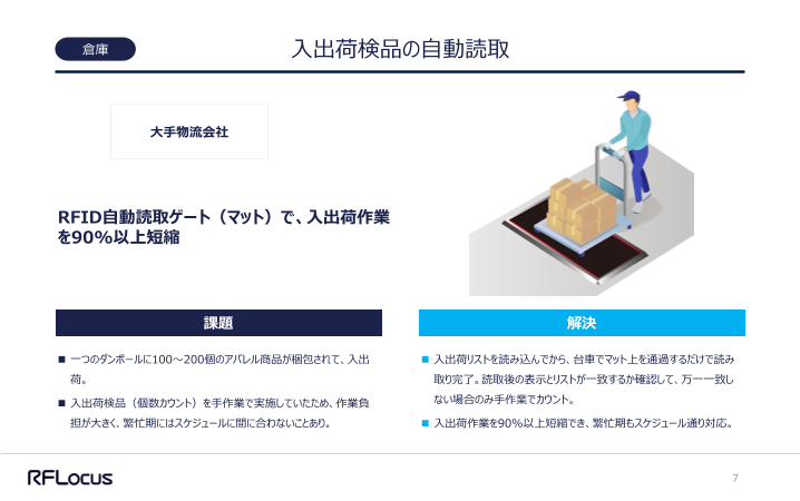 RFID自動読取ゲート(マット)で、入出荷作業を90%以上短縮 【課題】 一つのダンボールに100~200個のアパレル商品が梱包されて、入出荷。 入出荷検品(個数カウント)を手作業で実施していたため、作業負担が大きく、繁忙期にはスケジュールに間...