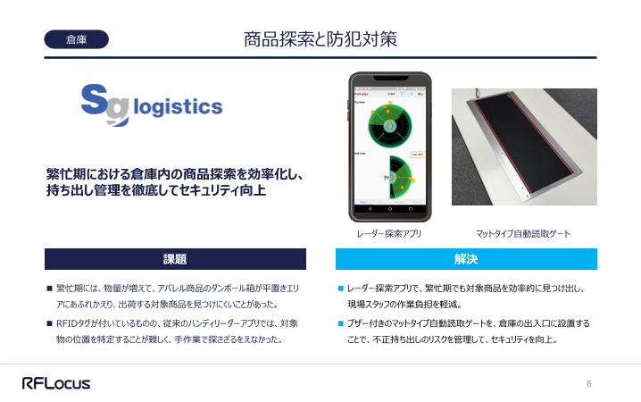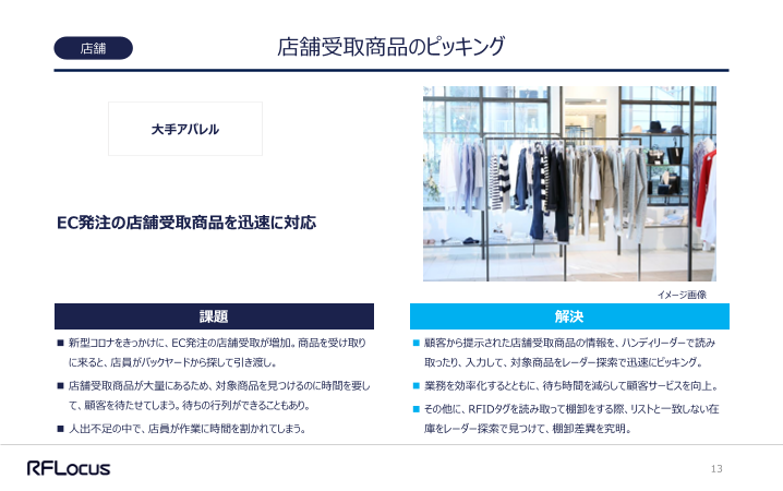 【課題】 新型コロナをきっかけに、EC発注の店舗受取が増加。商品を受け取りに来ると、店員がバックヤードから探して引き渡し。 【解決】 顧客から提示された店舗受取商品の情報を、ハンディリーダーで読み取ったり、入力して、対象商品をレーダー探索で迅速...