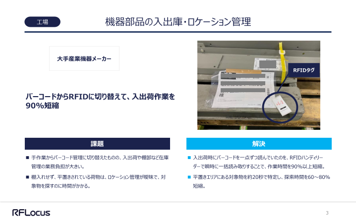 バーコードからRFIDに切り替えて、入出荷作業を90%短縮 【課題】 手作業からバーコード管理に切り替えたものの、入出荷や棚卸など在庫管理の業務負担が大きい。 【解決】 入出荷時にバーコードを一点ずつ読んでいたのを、RFIDハンディリーダ...