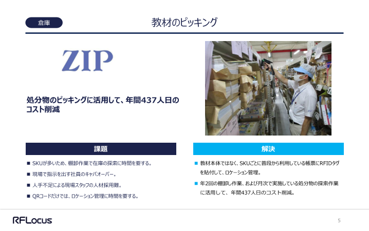 【課題】 SKUが多いため、棚卸作業で在庫の探索に時間を要する。 現場で指示を出す社員のキャパオーバー。 【解決】 教材本体ではなく、SKUごとに普段から利用している帳票にRFIDタグを貼付して、ロケーション管理。 ◆詳細はカタログをダ...