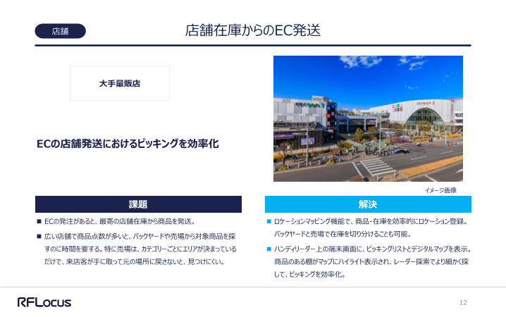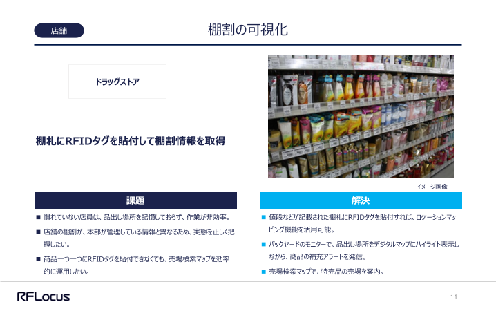 【課題】 慣れていない店員は、品出し場所を記憶しておらず、作業が非効率。 店舗の棚割が、本部が管理している情報と異なるため、実態を正しく把握したい。 【解決】 値段などが記載された棚札にRFIDタグを貼付すれば、ロケーションマッピング機能を活...