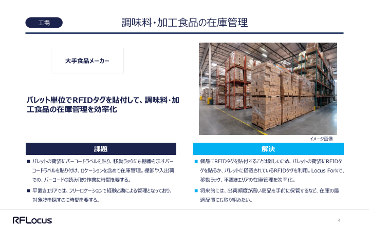 パレット単位でRFIDタグを貼付して、調味料・加工食品の在庫管理を効率化 【課題】 パレットの荷姿にバーコードラベルを貼り、移動ラックにも棚番を示すバーコードラベルを貼り付け、ロケーションを含めて在庫管理。棚卸や入出荷での、バーコードの読み取り作...