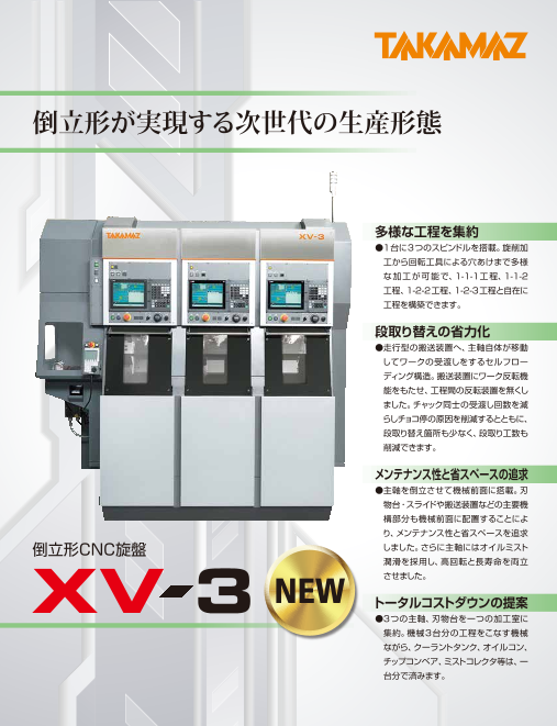 『XV-3』は、1台に3つのスピンドルを搭載した倒立形CNC旋盤です。 走行型の搬送装置へ、主軸自体が移動してワークの受渡しをする セルフローディング構造。 搬送装置にワーク反転機能をもたせ、工程間の反転装置を無くしました。 チャック同士...