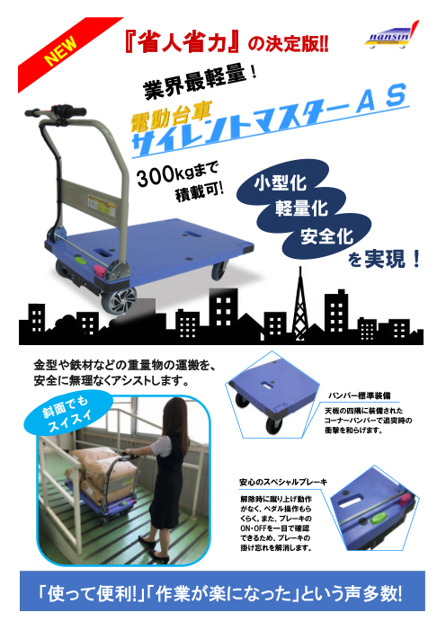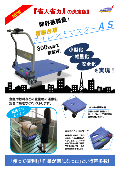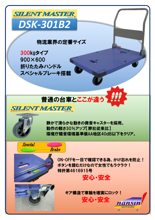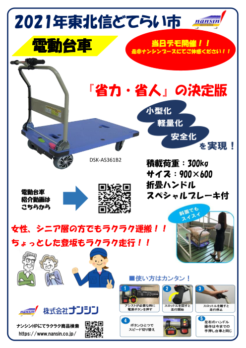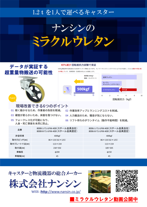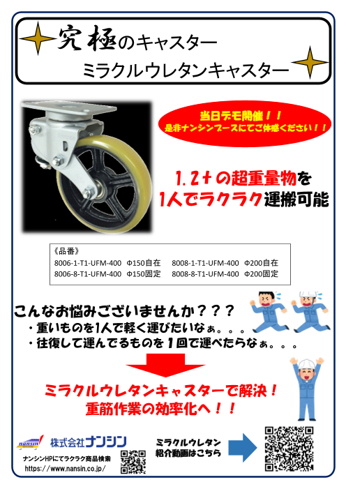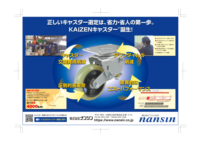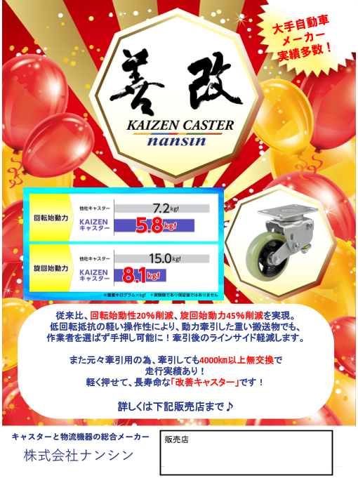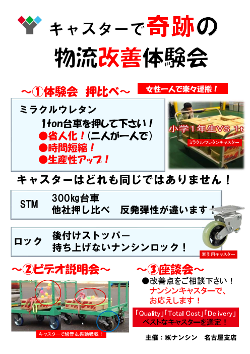 作業改善に取組を行われているお客様にご案内いたします。 キャスターは触ってみて、体感しないとその良さは伝わりません。 メーカーを変更するにも問題が無いと変更に踏み切れないと思います。 そこで、ナンシンでは台車を触っていただき、体感していただくことで...
