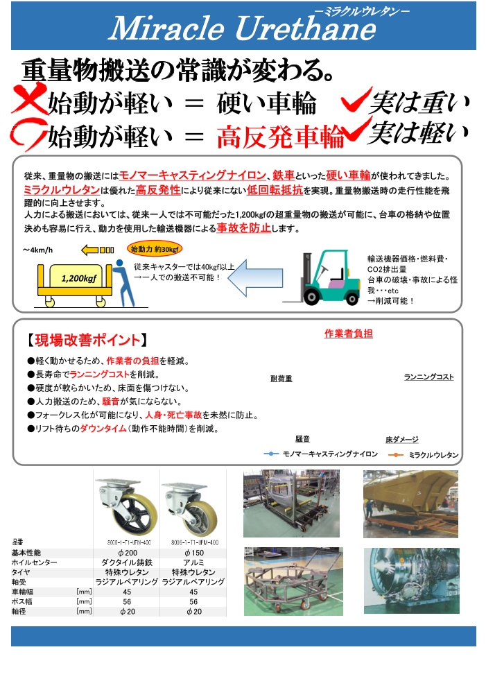 重量搬送・女性雇用・高齢化による作業改善をキャスターから ご提案が出来ます。疲労軽減・腰痛対策・ダウンタイムの削減が可能です。キャスターは触らないとわからない。数値ではわからない製品です。触って体感が出来ます。