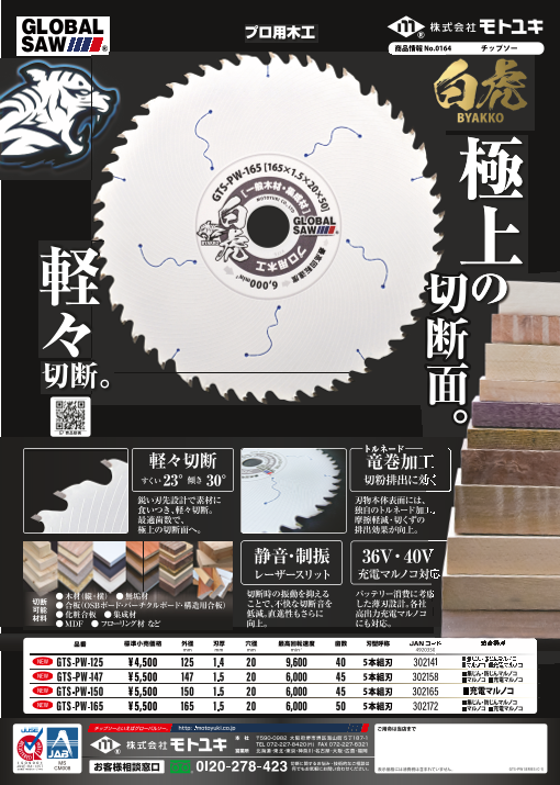 商品特長 ・外径125mm、147mm、150mm、165mmのサイズバリエーション。 ・せっこうボードを切っても木がスイスイ切れる。 ・超微粒子超硬チップの採用により、優れた耐久性を実現。 ・最適歯数・刃厚設計で、軽快で鮮やかな切れ味が持続。 ...