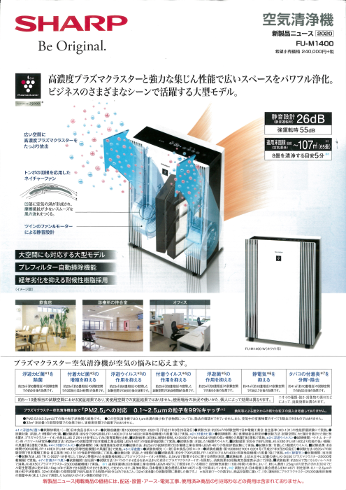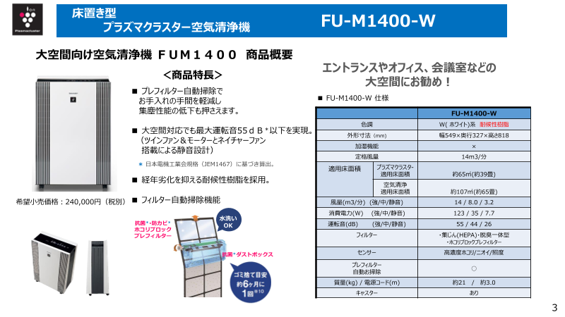 今回ご紹介の商品は、オフィスや飲食店、診療所の待合室など、今まで対応できていなかった大空間での空気の差別化を図りたい個人事業者の方にこちらの空気清浄機をご提案いたします。商品名はFU-M1400-Wです。プラズマクラスターイオン適用床面積は約65㎡(約3...