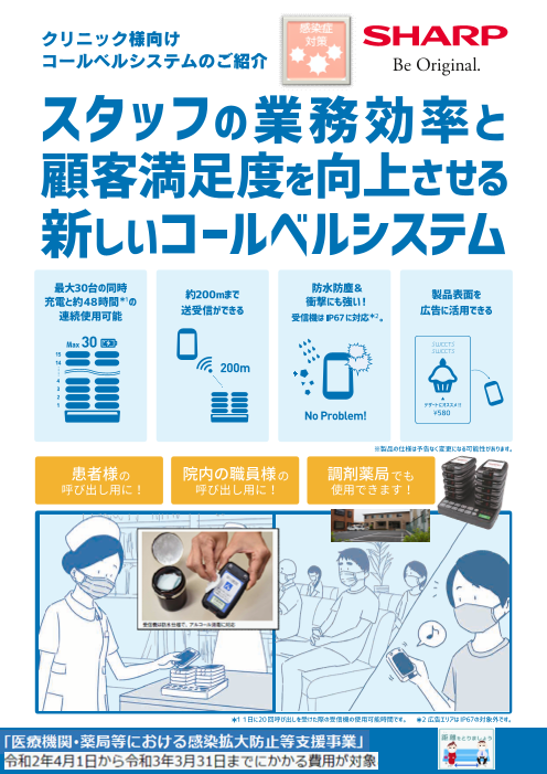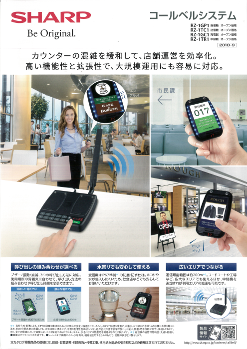 カウンターの混雑を緩和して、店舗運営を効率化。高い機能性と拡張性で、大規模運用にも容易に対応。通信可能範囲は約200m。商品ラインアップ(受信機RZ-1GP1、送信機RZ-1TC1、充電器RZ-1GC1、中継機RZ-1TR1)