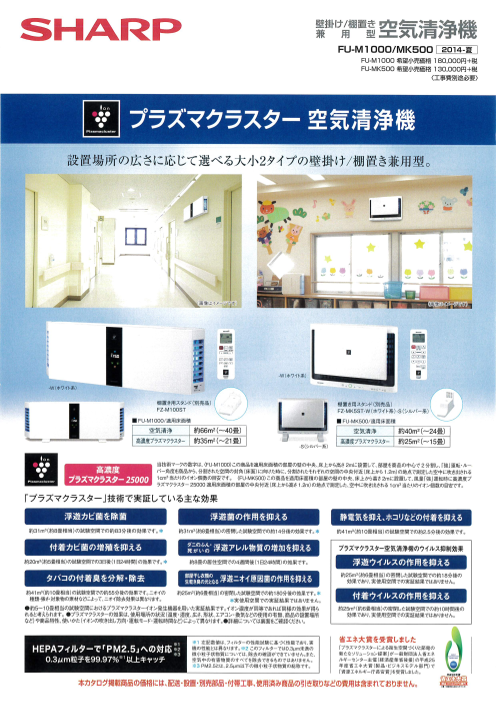 設置場所の広さに応じて選べる大小2タイプの壁掛け/棚置き兼用型となります。FU-M1000は2方向、FU-MK500は3方向に吹き出す気流により空間全体にプラズマクラスターイオンを放出します。人が集まる空間や食品を扱う空間を清潔に保つことができます。