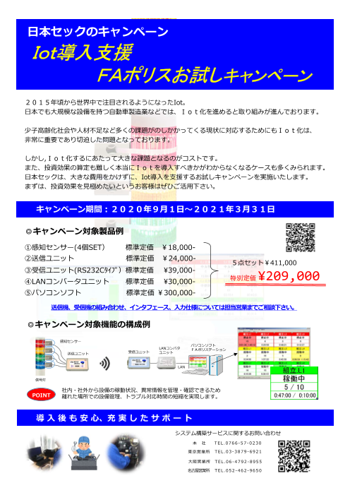 IoTという言葉は知っているが、実際どうしていいか分からない、導入までのハードルが高く中々実施に踏み切ることが出来ないといったお客様に向けた、IoT導入支援キャンペーンを行います。全体の定価を下げることでご導入頂く際のハードルを下げるお手伝いをさせて頂き...